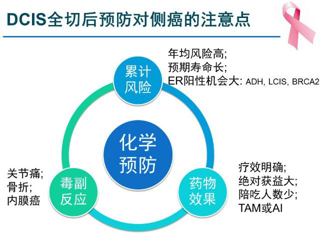 因此关于DCIS全切后是否考虑预防对侧癌,需要综合考虑如下三点:首先是患者对侧乳腺癌的累计风险较高,包括年均风险高、预期寿命长、ER阳性机会大;第二是药物效果较好,包括疗效明确、绝对获益大、陪吃人数少;第三是毒副反应小,这些毒副反应包括关节痛、骨折及内膜癌,不能因为想降低适当的乳腺癌风险而招致剧烈的毒副反应。