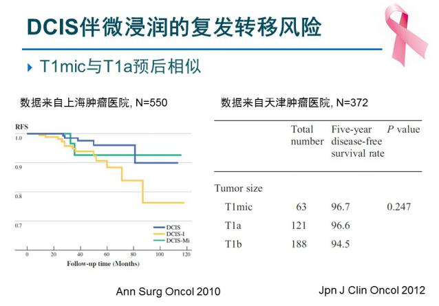 导管原位癌(DCIS)是一种肿瘤性导管内病变,特征为导管上皮明显增生,有轻度至重度的细胞异型,但未超出基底膜。DCIS有发展为浸润性癌的趋势, 但并非必然。如果DCIS肿瘤被诊断为微浸润,那么分期由Tis进展到T1mic,AJCC对于微浸润的规定是浸润灶最大径(单个)不超过1mm。