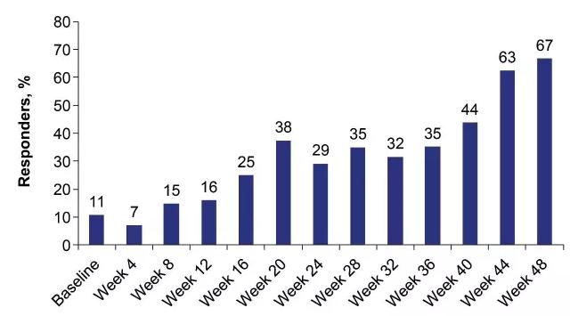 结果显示:在平均随访13.9月后,Ibrutinib治疗cGVHD的总体治疗反应率达67%(28/42),其中完全缓解率(CR)为21%(9/42),部分缓解率为45%(19/42)。