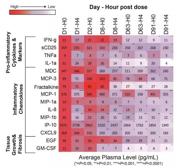 此外,对于出现治疗反应(指出现CR或PR的患者)的28例患者而言,在≥20周以及≥32周时,其持续性治疗反应率分别达71%和48%。在糖皮质激素需求量方面,有75%(21/28)的cGVHD患者糖皮质激素需求量<0.15 mg/kg/d(见图1),其中5例患者已停用。而且,cGVHD症状评分方面也有显著改善。另外值得注意的是:在进行Ibrutinib治疗后,与炎症、纤维化以及cGVHD相关的可溶性血浆因子CD25及IP-10均存在下降。(见图2)。