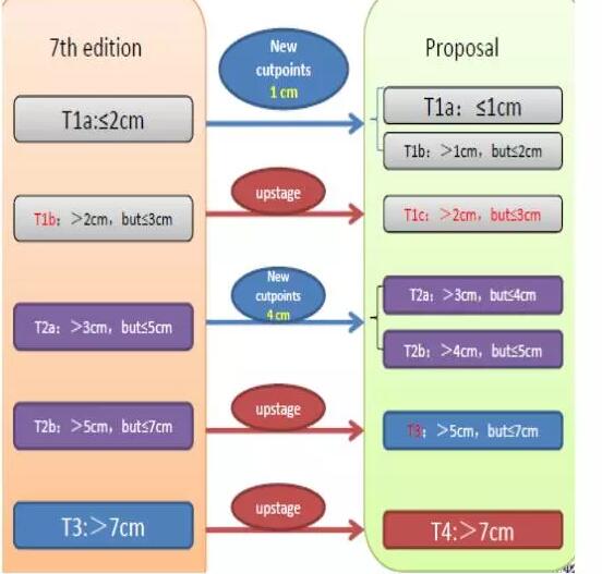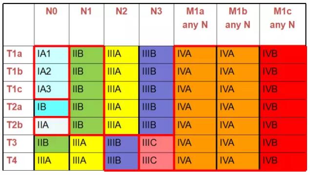 TNM分期:①T1a、T1b 和T1c(N0M0)分别归为IA1、IA2和IA3期;②对于T1a-T2a(N1M0),由IIA期归为IIB期;③对于T3N2M0,则由ⅢA期归为ⅢB期;④对于T3/T4(N3M0),由ⅢB期归为ⅢC期;⑤M1a和M1b归为ⅣA期,M1c归为ⅣB期。