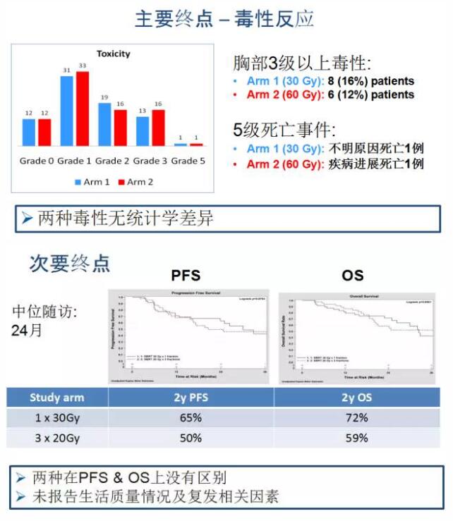 研究结论:本项随机II期研究证明30Gy 1次分割与60Gy 3次分割的毒性、无进展生存期和总生存期相当;单次放疗的可能获益包括:患者舒适;减少费用。