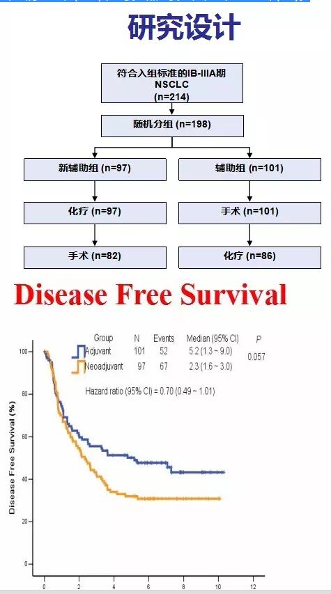 研究作者结论:研究发现,多西他赛联合卡铂辅助和新辅助治疗可切除临床IB-IIIA期NSCLC可行且安全;两组3年DFS和OS无统计学显著性差异;辅助治疗组的5年DFS和5年OS有获益趋势;辅助化疗优于新辅助化疗,回答了新辅助化疗与辅助化疗二者之间的争论。