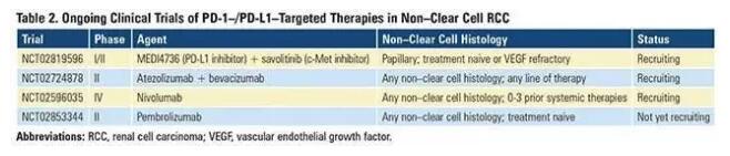 这些研究突出了PD-1靶向治疗在非透明细胞疾病中的价值。一些研究目前正在评估PD-1靶向治疗在非透明细胞RCC中的效用(表2)。 一项评估Atezolizumab和贝伐单抗的开放、多中心、单臂、II期研究正在招募患者(NCT02724878)。