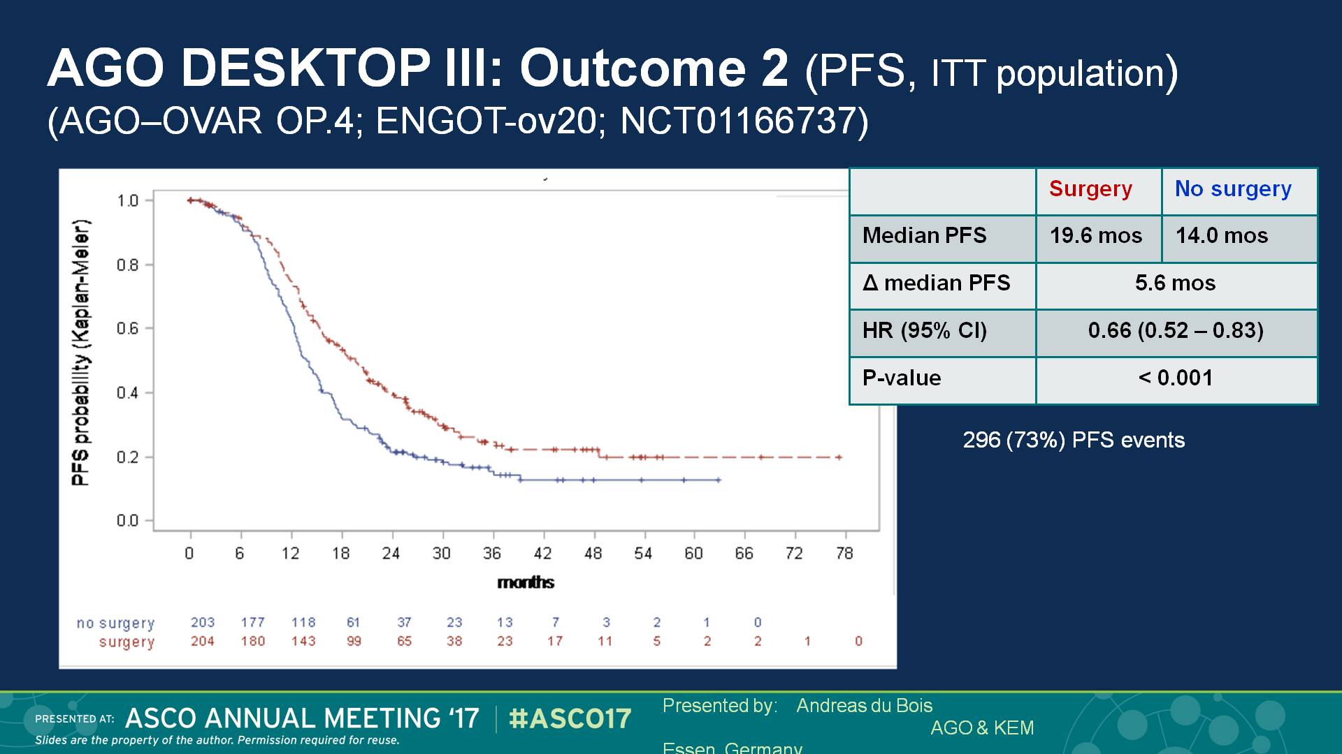 AGO DESKTOP III/ENGOTov20试验是评价复发卵巢癌二次减瘤术意义的随机、对照、Ⅲ期研究。研究者在2017 ASCO会议上报告了PFS结果。研究共入组407例首次复发、且无铂治疗间隔(TFIp)6个月以上、AGO评分好(ECOG 0分、腹水≤500 ml、第一次手术完全切除)的患者,随机分为单纯二线化疗组(非手术组)和手术+化疗组。非手术组与手术+化疗组的中位PFS分别为14个月和19.6个月。中位至首次后续治疗时间(TFST)分别为13.9个月和21个月。相比单纯二线化疗组,二次减瘤术增加了患者的PFS获益。