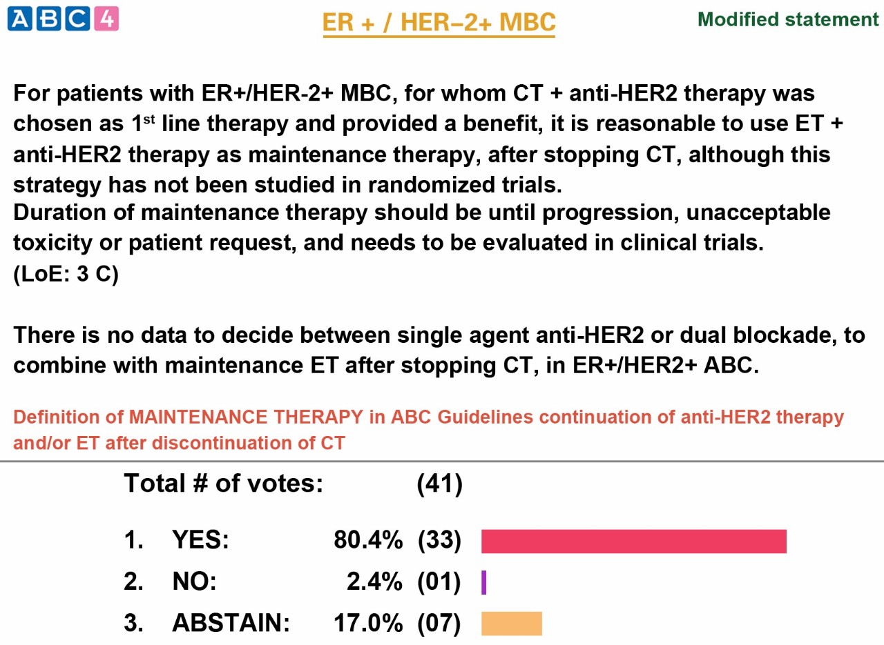 值得讨论的是今年ABC4会议特别针对HR+/HER2+晚期乳腺癌维持治疗环节进行了投票。我们知道TAnDEM试验显示阿那曲唑联合赫赛汀改善了患者的PFS及OS;在EGF30008研究中拉帕替尼联合来曲唑同样改善患者的PFS;尽管对于HR+/HER2+晚期乳腺癌一线治疗受益的患者尚无后续维持治疗的直接证据,但对于靶向联合内分泌药物一线治疗的证据是有力的,将此结果借鉴至HR+/HER2+晚期乳腺癌一线治疗后的维持治疗,不失为一种替代方法。当然,在选择维持治疗的方案时,还应该综合考虑患者年龄、身体状况、经济条件等诸多因素,进行合理的治疗。本次大会的投票投票环节中有80.4%的专家同意用靶向药物联合内分泌治疗进行维持治疗,我认为是对上述观点的肯定。由于相关的研究证据尚不充足,提示临床医生在今后的临床实践中需增加此类研究的探索。
