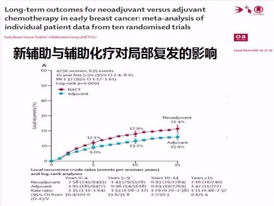 2007年的一篇荟萃分析提示新辅助化疗后全乳切除率下降,新辅助化疗和辅助化疗对局部复发没有影响,局部复发率在计划保乳的患者和降期后保乳的患者中也没有差异。但是2017年12月在线发表在lancet上的来自早期乳腺癌临床试验协作组(EBCTCG)的一篇荟萃分析则提出了不同的观点。