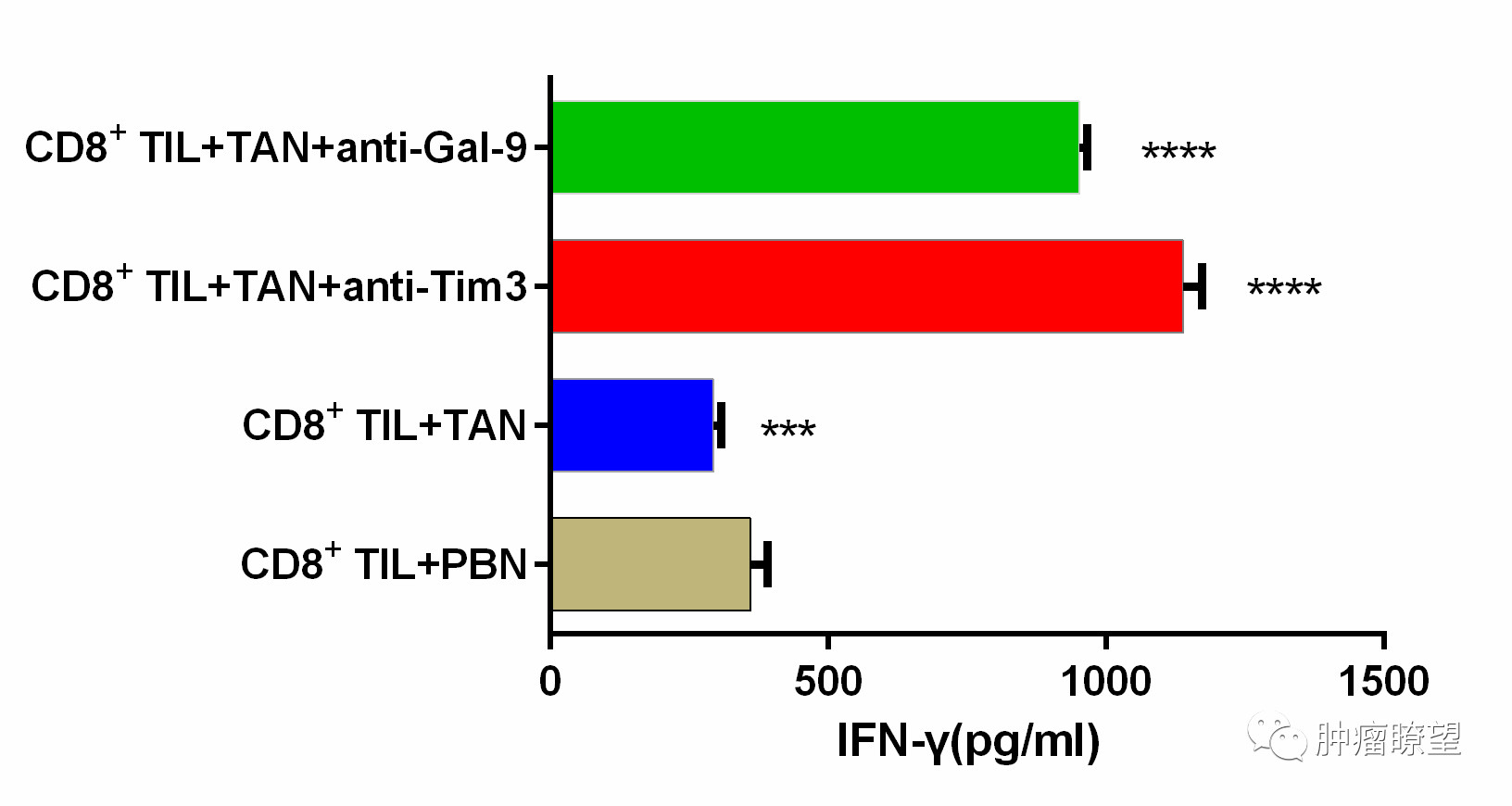这些肿瘤中浸润的中性粒细胞显示活化的CD54+表型,也表达高水平的半乳糖凝集素9(Gal-9)。由肿瘤条件培养基激活的中性粒细胞生命明显延长并且强烈表达具有与它们浸润在肾癌组织中相似表型的Gal-9,而肿瘤浸润中性粒细胞上Gal-9和CD54表达水平之间存在显著正相关性。活化的Gal-9 +嗜中性粒细胞有效地抑制了体外正常T细胞干扰素-γ(IFN -γ)的分泌,通过抗体阻断Gal-9/Tim-3途径可以逆转被抑制的CD8+T细胞杀伤功能。