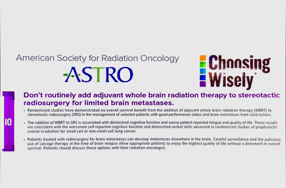 NCT00377156研究纳入了213例仅有1-3个脑转移灶的患者,随机分至SRS组及SRS联合WBRT组,两组总生存没有差别,3个月内的认知功能减退在SRS组发生率明显降低。对于有限数量的脑转移病灶应采取SRS或手术等更积极的局部治疗手段。美国ASTRO指南也提出,在手术或SRS治疗后不应将WBRT作为常规辅助治疗。另外,新型WBRT技术,如规避海马区照射的全脑放疗可以减少神经认知功能的毒性,具有临床应用前景。