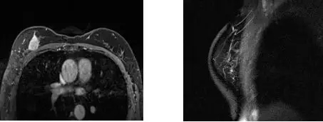 2014-12-15乳腺MRI:右乳上方占位,BI-RADS 5;右腋下少许淋巴结,部分皮质稍厚,转移待排;左乳腺体改变,BI-RADS 1。