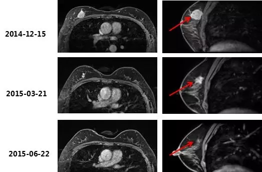 2015-6-22乳腺MRI示:右乳上方占位NAC 8周期后,肿块较前明显缩小,几近消失,BI-RADS 6。依据RECIST 标准评价,PR。