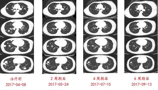 2017年2月,复查CT示:多发性肺转移。2017-02-10行右肺穿刺病理示:(右肺下叶穿刺活检)ER(-),PR(-),Her-2(+),结合HE切片,本例符合乳腺癌肺转移。