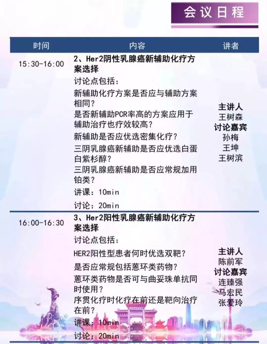 上午还有一个名家讲堂,由邵志敏教授来给大家做新辅助化疗的共识与争议的主题演讲,更进一步对新辅助这个内容进行了总结的发言。会上还有好几位名家做了非常精彩的发言,后面的环节是一个非常接地气的环节,关于乳腺癌病人化疗方案个体化的选择。我们分别针对HER2阳性与HER2阴性乳腺癌进行了主题演讲和充分讨论。对于每一个病人,每个医生会有方案优劣的比较和选择,但不是所有医生都会给病人选择一致的方案。这个环节所讨论的是每个医生给病人选择化疗方案的时候,有哪些考虑点,为什么A方案胜过B方案,我觉得这样的交流是非常好的。此外,当天下午还有一个圣安东尼奥的最新的会议快递,也是圣安东尼奥以及乳腺癌全年各个治疗领域的总结,这是本次会议的内容。
