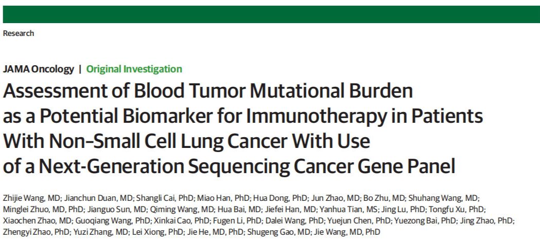 原文链接:Wang Z,Duan J,Cai S,et al.Assessment of Blood Tumor Mutational Burden as a Potential Biomarker for Immunotherapy in Patients With Non-Small Cell Lung Cancer With Use of a Next-Generation Sequencing Cancer Gene Panel.JAMA Oncol 2019;:.DOI:10.1001/jamaoncol.2018.7098