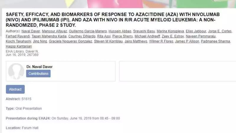 梁洋教授:Naval Daver等的研究针对难治复发AML这一类治疗领域的难点问题,进行了联合免疫检测点药物的有效探讨。由于在MDS和AML的干细胞中,前期的研究提示有PD-1以及CTLA-4的异常表达,为使用相应的免疫监测点药物提供了科学依据。本临床实验初也初步证实了相应的有效性,值得进行扩大化的临床实验,为该类患者提供更多的治疗选择并提高生存情况。