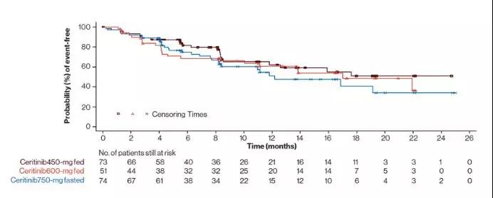 王教授:既往在ASCEND-1及ASCEND-5等临床试验中,塞瑞替尼采用的剂量为750mg空腹口服,这一剂量的胃肠道不良事件发生率比较高,所以很多患者不能完全耐受。在ASCEND-8临床研究中,探索性地比较了450mg随餐服用和750mg空腹服用在血药浓度和不良反应方面的差异,研究结果显示:450mg随餐服用相对于750mg空腹服用,疗效相似,甚至450mg随餐服用有疗效更佳的趋势;同时,450mg随餐服用的不良事件发生率明显低于750mg组。一线使用450mg随餐服用,PFS已经超过了25个月,仍然未达到中位PFS。因此,塞瑞替尼采用450mg随餐服用的剂量、方式,能为ALK阳性晚期NSCLC患者带来更好的临床获益。