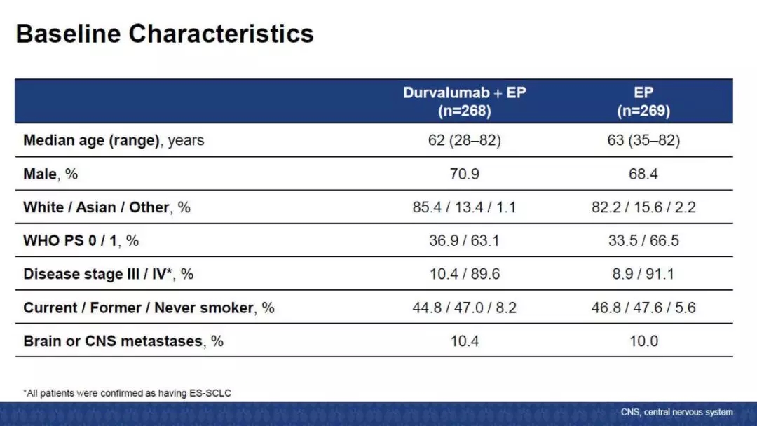 CASPIAN研究是一项随机、开放标签的全球多中心III期临床试验,针对的是广泛期SCLC患者的一线治疗,这项临床试验在全球22个国家的200多个中心进行,包括美国、欧洲、南美、亚洲和中东。研究分为三组:durvalumab联合标准化疗(依托泊苷+顺铂或卡铂)、durvalumab+tremelimumab(抗CTLA-4抗体)+化疗组以及单纯化疗的对照组。实验组中患者最多接受4个周期的化疗,对照组患者最多接受6个周期化疗,同时根据情况选择预防性脑放疗(PCI)。主要研究终点是总生存期(OS),次要终点包括无进展生存期(PFS) 、客观缓解率(ORR) 、安全性和耐受性和健康相关QoL。本次会议报道了durvalumab联合化疗对比单纯化疗组的OS结果。该研究还会继续进行,直到durvalumab+ tremelimumab+化疗联合治疗组的生存期数据成熟。