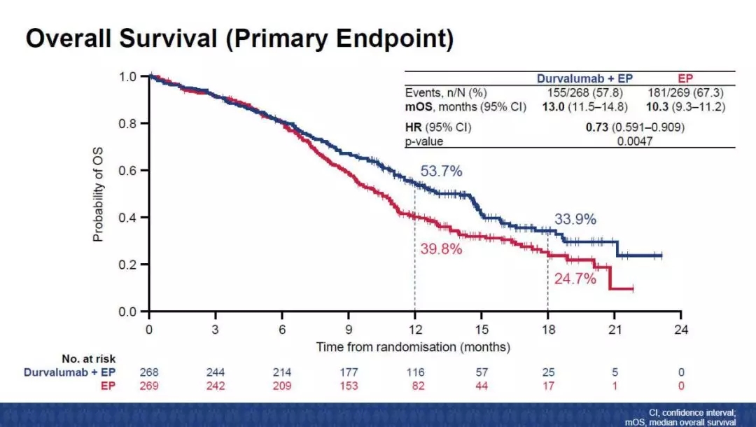 CASPIAN研究中,durvalumab联合组和单纯化疗组分别入组了268例和269例患者,与单用化疗相比,durvalumab联合4周期的标准化疗可显著改善OS,具有统计学意义和临床意义。durvalumab联合化疗组的中位OS为13.0个月,单纯化疗组的中位OS是10.3个月,联合组死亡风险降低了27%(HR=0.73,p=0.0047),在所有亚组人群中均有获益。durvalumab联合化疗组的12个月和18个月OS率分别为53.7%和33.9%,而单纯化疗组分别为39.8%和24.7%,联合组提高了13.9%的12个月OS率和9.2%的18个月OS率。