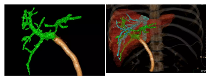 术后上腹部增强CT血管重建显示门静脉通畅,肝脏血供良好
