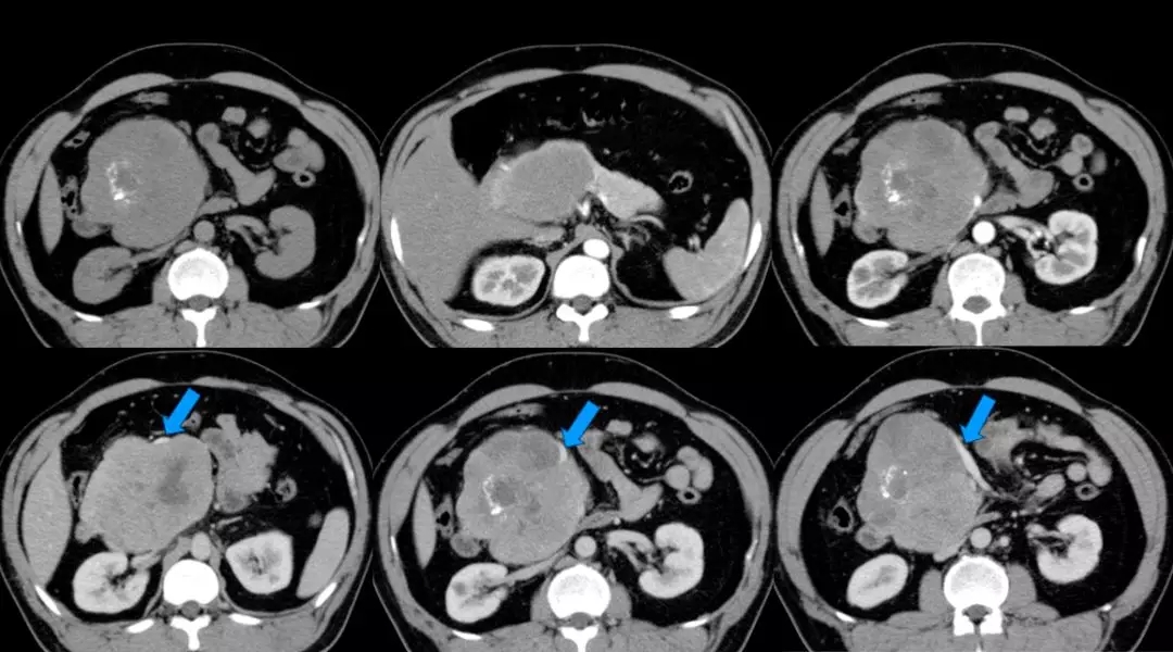 上腹部增强CT:胰头颈体积增大、胰头、颈部可见巨大软组织肿块影,长径约12 cm,与周围分界不清,其内密度不均匀,见片状低密度影及点片状致密影,增强扫描呈不均匀强化,病灶较胰腺实质强化幅度低,其内可见无强化坏死区。腹腔见数个小淋巴结影。脾周可见软组织密度影,长径约1.8 cm,强化方式与脾脏一致。双肾可见多个囊状无强化低密度影。左肺上叶可见斑片状密度增高影,增强可见明显强化。考虑:(1)胰头颈占位,考虑恶性;(2)副脾;(3)双肾多发囊状;(4)左上肺病变,炎症可能。(蓝色箭头为受侵PV-SMV)