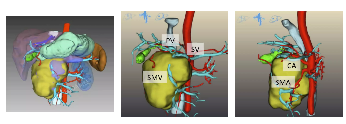 上海长征医院胰胆肿瘤MDT邵成浩教授团队经过讨论,考虑为胰头颈部实性假乳头状瘤,是一种少见的低度恶性胰腺肿瘤,在临床表现和组织病理学上具有与其他胰腺肿瘤不同特点,手术指征明确。由于该类型肿瘤生长缓慢,极少出现梗阻性黄疸,多为体检发现。常见临床表现为腹痛、腹胀、腹部肿块等,肿瘤多为实性或囊实性,可有包膜,与周围组织界限清楚,部分可有粘连。该类肿瘤对放化疗不敏感,手术切除是首选治疗方法。但由于该患者胰头肿瘤较大,生长时间长,已侵犯部分门静脉(PV)及肠系膜上动脉(SMV),手术难度大,需做好充分围手术期准备。