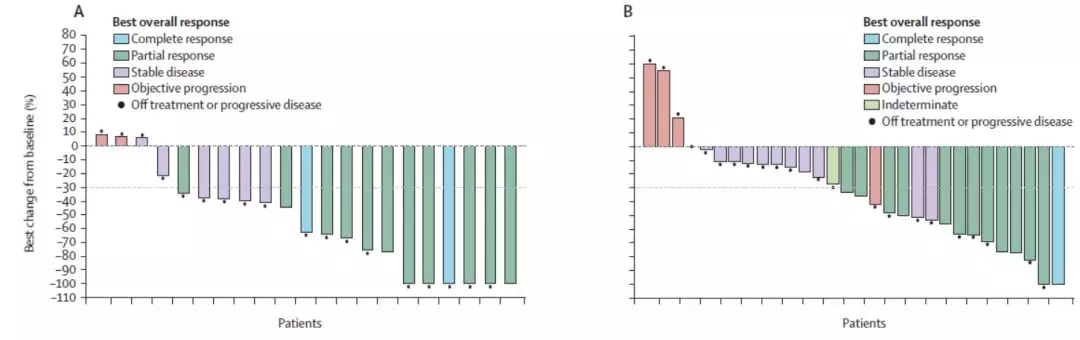 从安全性来看,96%的患者出现了治疗相关不良反应,但多数比较轻微,3度及以上不良反应发生率为49%,最常见的不良事件为高甘油三酯血症(19%)和高胆固醇血症(14%), 7%的患者出现治疗相关的严重不良事件,没有治疗相关的死亡事件出现。36%的患者因不良反应导致暂时停药,25%的患者因不良反应导致剂量调整。导致治疗暂时中止最常见的原因为治疗相关的高甘油三酯血症(9%)、水肿(7%)和周围神经病变(6%)。