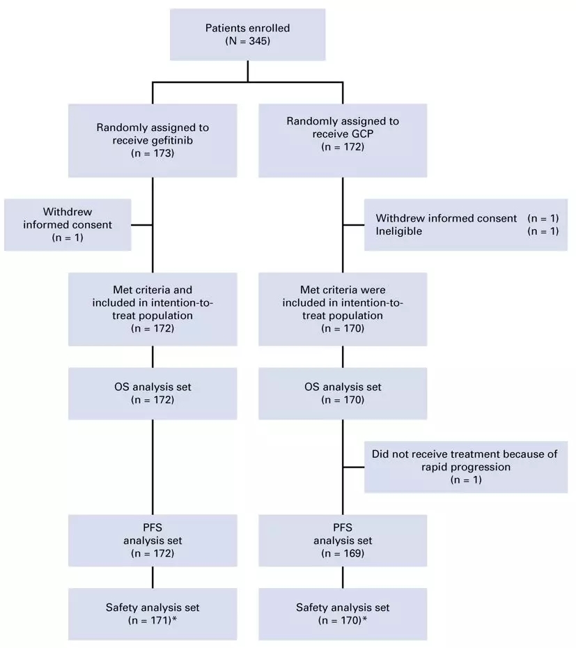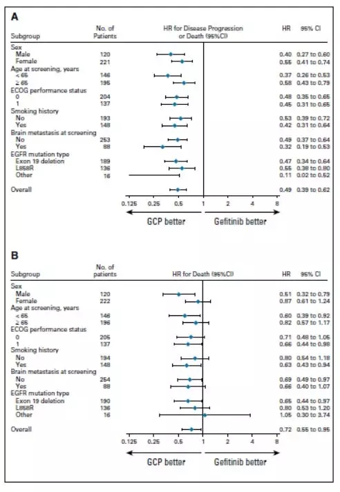 研究方法:这是一项多中心、III期临床研究,共纳入日本47家中心。所有患者均为病理学确认的初治非鳞非小细胞肺癌,除19del或21L858R突变外,非经典突变仅允许18G719A/C/S/和21L861Q的患者入组,患者PS评分0-1分。携带原发性T790M突变的、有症状脑转移的及存在其他恶性肿瘤病史的患者不能入组本研究。随机化前,患者按照性别、临床分期、突变类型及吸烟状态进行分层,并随机分为吉非替尼单药组(250 mg,口服,每日一次)或联合培美曲塞(500 mg/m2)联合卡铂(AUC=5,每三周一次)组,患者至多接受6次化疗后,进行靶向联合培美曲塞的维持治疗。治疗应当持续进行,直至出现不可耐受的毒性反应或疾病进展或患者退出研究。疾病进展后,如研究者认为患者可以继续从治疗中获益,则允许继续接受原方案治疗,吉非替尼单药组患者进展后,优先采用以培美曲塞联合铂类的化疗方案。第一年每2个月进行一次疗效评估,随后每3个月进行一次疗效评估。研究采用EORTC-QLQ-C30来评估患者生存质量。本研究的主要研究终点为复合终点:PFS、PFS2及OS,次要研究终点为ORR、安全性及生活质量。PFS定义为从随机化开始至疾病进展或患者死亡的时间,PFS2定义为从随机化开始至二线治疗进展的时间(联合治疗组PFS=PFS2),但随后作者发现,PFS2的定义在吉非替尼单药组包括了一线进展后、二线启动前的这部分时间,因此,修订后的PFS2将这部分时间去掉,OS定义为随机化开始至患者出现死亡事件。