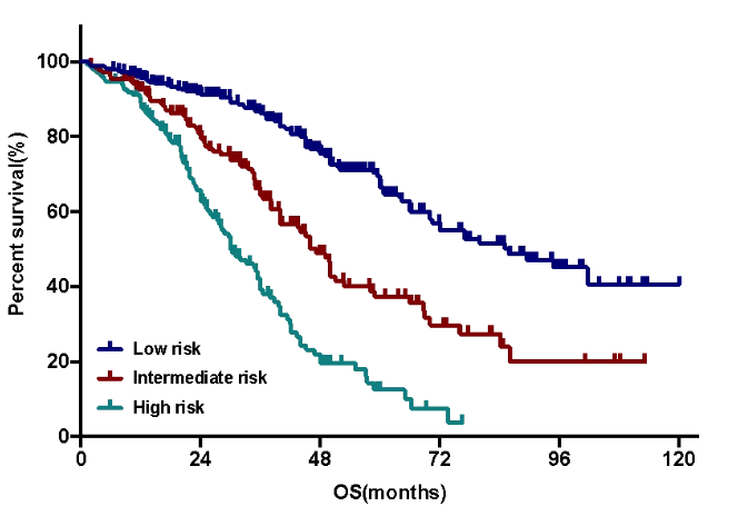 该项研究通过对603例初治多发性骨髓瘤(NDMM)病例进行总结及多因素分析,筛选出五个独立的不良预后因素;通过对各个危险因素进行加权及赋值,建立了用于预测NDMM患者预后的危险分层,并在不同亚组中进行了验证。该预后模型首次纳入了能够反映患者免疫状态的危险因素(外周血淋巴细胞绝对值与单核细胞绝对值比值,LMR),为免疫治疗时代多发性骨髓瘤患者的预后判断提供了指导。