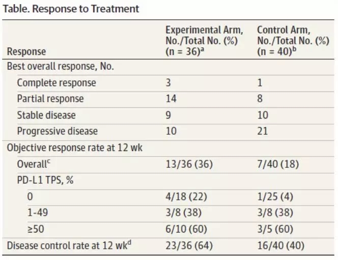研究的首要终点为12周的ORR,次要终点为12周的DCR、PFS、OS及安全性。作者的研究假设为主要研究终点由单药组的20%提高到联合治疗组的50%。