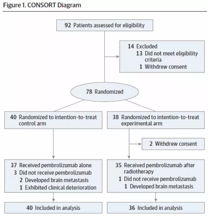 研究结果:从2015年7月1日至2018年3月31日,共92例患者接受了筛选并有76例患者符合入组标准,实验组和对照组分别入组36例和40例患者(图1)。两组基本临床病理特征均衡可比,对照组PD-L1表达阴性患者比例在数值上更高(50% vs. 66%)。实验组和对照组分别有97%和92%的患者接受了至少一周期Pembrolizumab治疗。