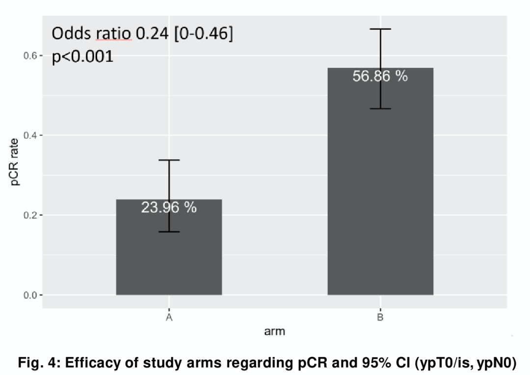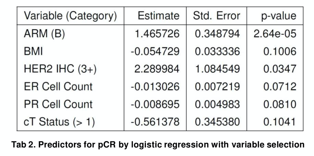 研究结果显示ITT人群均匀分布于两组,平均年龄53岁,cT2-4占58%;28%腋结阳性;43%组织学分级III级(G3),两组患者HER2 3+均占90%以上。主要研究终点pCR率在TP+ET组为24%(n=96);TP+wPacl组为57%,双靶联合化疗组完胜,p值<0.001。月经状态、年龄、BMI、HER2表达水平、ER、PR与pCR率显著相关。