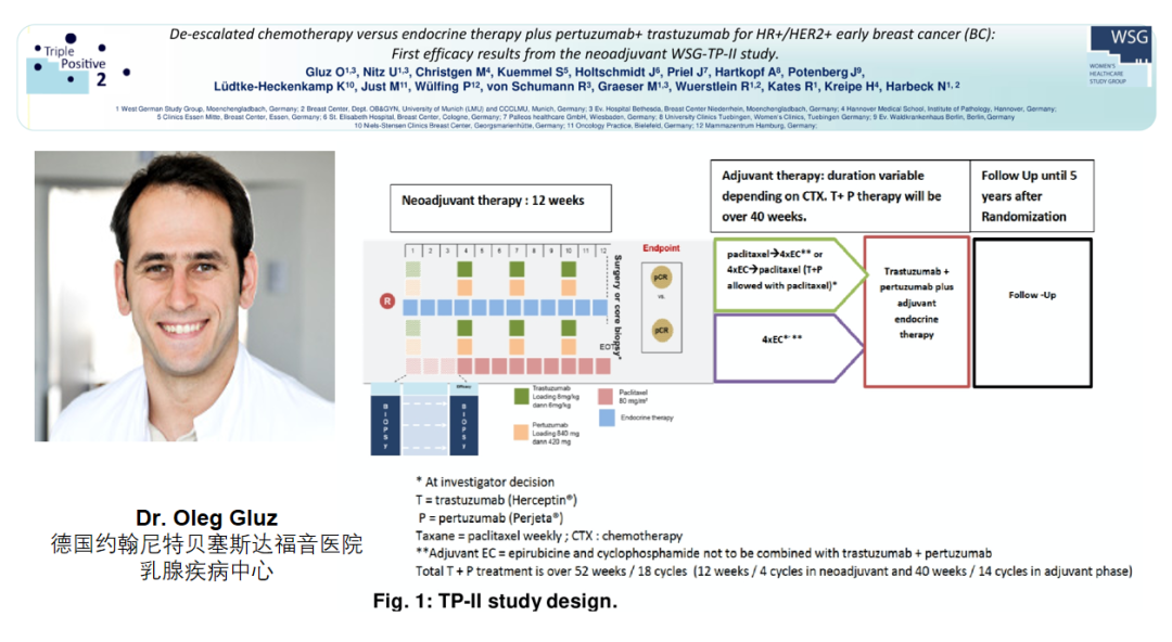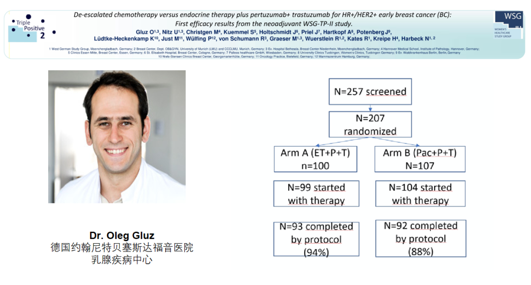 该研究的PI:格鲁兹博士(Dr Oleg Gluz)是一名来自德国约翰尼特贝塞斯达福音医院乳腺疾病中心的医生。说起格鲁兹的名字,可能并不像很多知名国际大咖那样家喻户晓,但他不仅是德国西部研究协作组的成员,同时也可以称得上是当代德国乳腺癌治疗领域的中坚力量。最值得钦佩的是,多年来他砥志研思、心无旁骛地寻找各种分子亚型早期乳腺癌可以规避化疗的循证医学数据。比如大家耳熟能详的PlanB研究(HR+HER2-LN-者OncotypeDX豁免化疗)、WSG-ADAPT-TN (TNBC者nab-Pac联合Carbo或Gem豁免蒽环)等系列ADAPT研究都出自格鲁兹博士的设计,这些研究的结果自2016年开始陆续在各大乳腺癌国际论坛和权威杂志发表。格鲁兹博士能够远离世俗的虚荣和浮华,潜心专研早期乳腺癌的降阶梯治疗策略,这份匠心,属实让人钦佩。