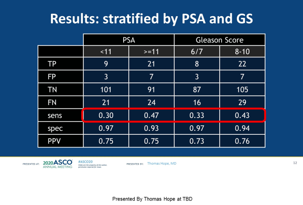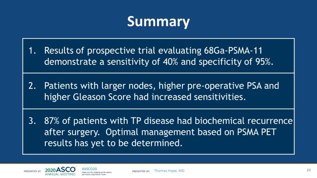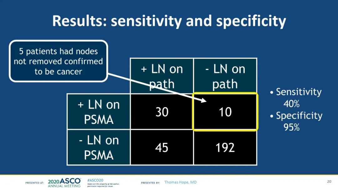 研究结论:在接受RP和PLND的中至高危PCa患者中,68Ga-PSMA-11 PET检测到盆腔淋巴结转移的敏感度为0.40,特异性为0.95。较高的PSA和较大的淋巴结与灵敏度增加相关。