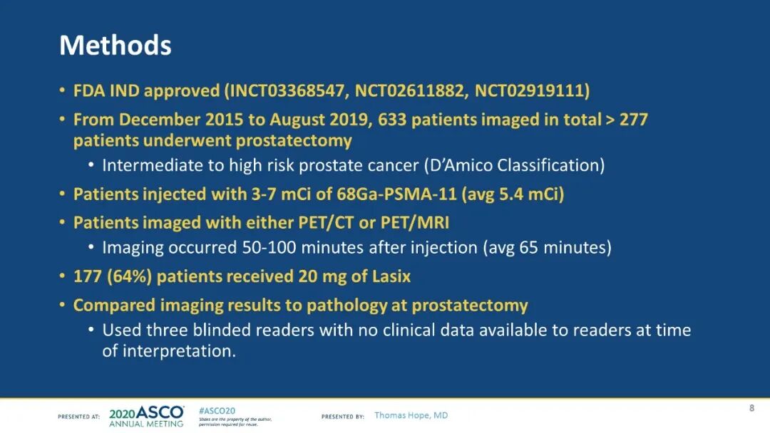 研究方法:该研究为一项开放标签的前瞻性多中心单臂3期影像学试验。拟行淋巴结清扫(PLND)的中高危前列腺癌(PCa)患者在加利福尼亚大学洛杉矶分校(UCLA)和旧金山大学(UCSF)被入组(NCT03368547,NCT02611882,NCT02919111),并于术前行68Ga-PSMA-11 PET检测。主要终点是应用基于区域的相关性,分析68Ga-PSMA-11 PET在每名患者上检测N1的敏感性和特异度(同PLDN的病理作比较)。每次扫描由三名互盲的独立中心读片人(BICR)进行阅读,读片结果基于多数决定原则。