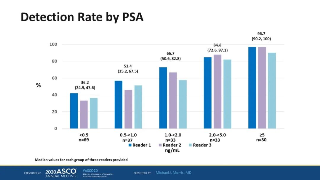 研究结果:该研究共对208名男性患者(平均 PSA 0.8 [0.2~98.4] ng/mL)进行了PyL PET-CT检查。且研究达到了主要终点:结果显示三名评阅者的CLR为84.8% ~87.0%;CLR的LLCI均>77%。根据局部影像学评估,PSMA摄取的病灶存在于69.3%(142/208)的患者中,且63.9%(131/205)的患者在PyL-PET/CT扫描后有治疗方案的改变。其中78.6%(103/131)的患者在PyL扫描后发现为阳性,21.4%(28/131)的患者PyL扫描后发现为阴性。患者治疗的改变包括:局部挽救性治疗转变为全身系统治疗(n=58);治疗前观察(n=49);从非治愈性的全身系统治疗转化为挽救性局部治疗(n=43);进行治疗转化为观察(n=9)。患者PyL耐受性良好,1例患者发生药物相关的严重副反应(过敏),最常见的副反应为头痛(n=4;1.9%)。