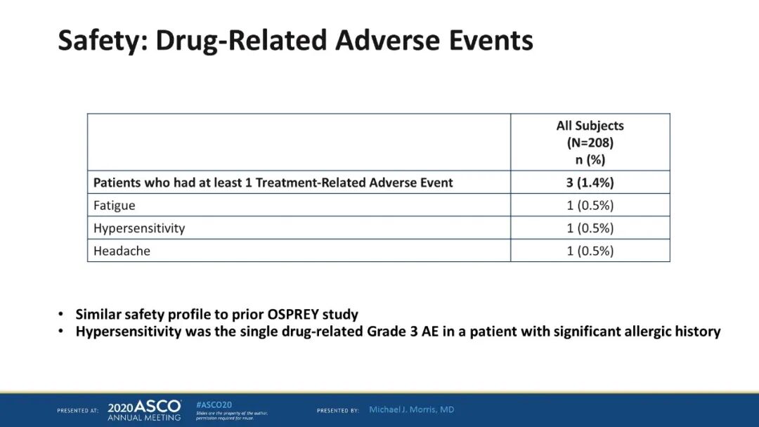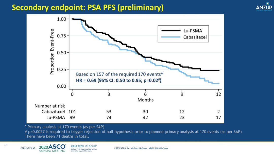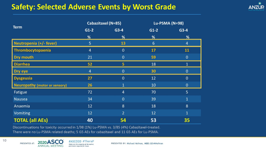 安全性方面,III-IV级毒副反应(AEs)LuPSMA组为31/98(32%),卡巴他赛组为42/85(49%)。因毒副反应未能继续治疗的患者共有4例,其中LuPSMA组1/98(1%),卡巴他赛组3/85(4%)。没有发生治疗相关的死亡。