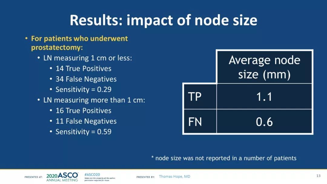 研究结果:2015年12月到2019年8月间,共633名患者接受了一期68Ga-PSMA-11 PET治疗,277/633(44%)的患者随后接受了RP和PLND。中位初始PSA为11.1(0.04-147),75/277 名患者 (27%) 病理显示N1。应用基于区域的分析,敏感度、特异性、阳性预测值和阴性预测值对于N1的检测分别为 0.40(0.34,0.46),0.95(0.92,0.97),0.75(0.70,0.80),0.81 (0.76,0.85)。PSA越高的患者敏感度也越高:PSA <11 ng/ml 的患者敏感度为0.29(0.24,0.35);PSA >11的患者敏感度为0.48(0.42,0.54)。淋巴结越大的患者敏感度越高:淋巴结<10mm的患者的敏感度为0.30(0.25,0.36);淋巴结>10mm的患者敏感度为0.68(0.63, 0.74)。真阳性淋巴结的平均大小为10mm,而假阴性淋巴结平均大小为4mm。