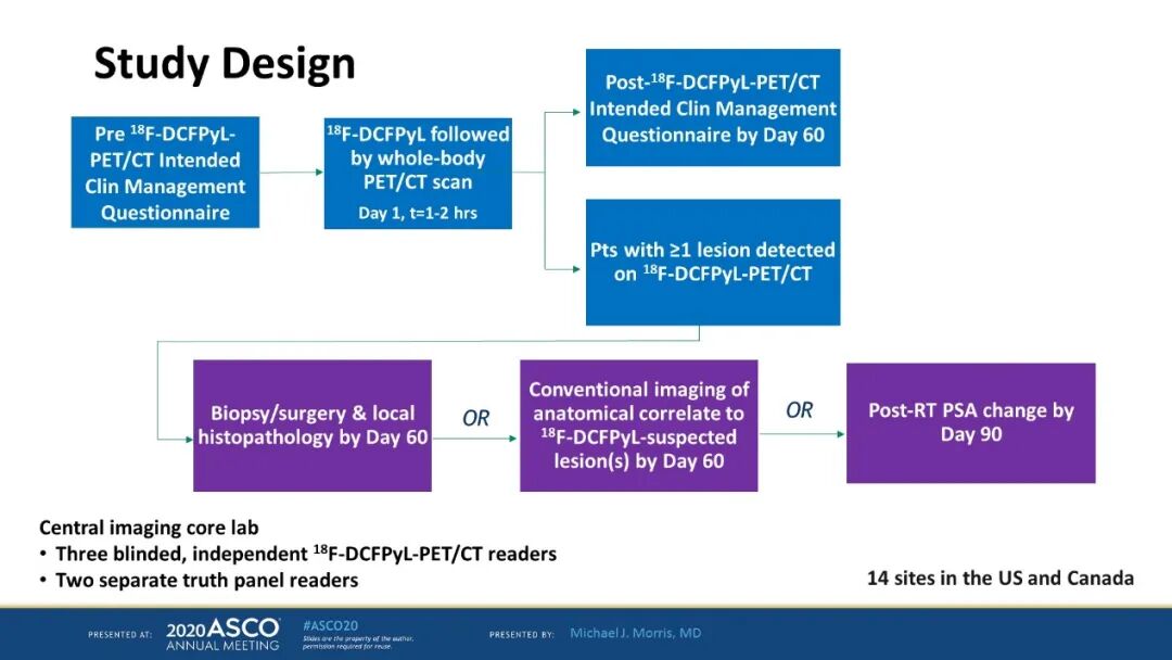 研究方法:研究纳入人群为≥18岁且接受过前列腺癌根治术后PSA升高、标准的影像学检查(如:CT/MRI,骨扫描)显示阴性或无法确定的患者。单次9 mCi(333MBq)±20%的剂量注射PyL后1-2个小时行PET/CT检查。主要终点是正确定位率(CLR),定义为通过PyL-PET/CT鉴定的至少一个病灶与复核标准(病理、相关影像学或PSA反应)1:1对应的患者百分比。影像评估由三名独立、不知情的PyL-PET/CT评阅者分别进行评阅,其中两名评阅者的CLR的95% CI下限(LLCI)超过20%则试验成功。次要终点为PyL-PET/CT对患者临床决策的影响,基于治疗医师PyL-PET-CT前后记录的临床计划来判断。