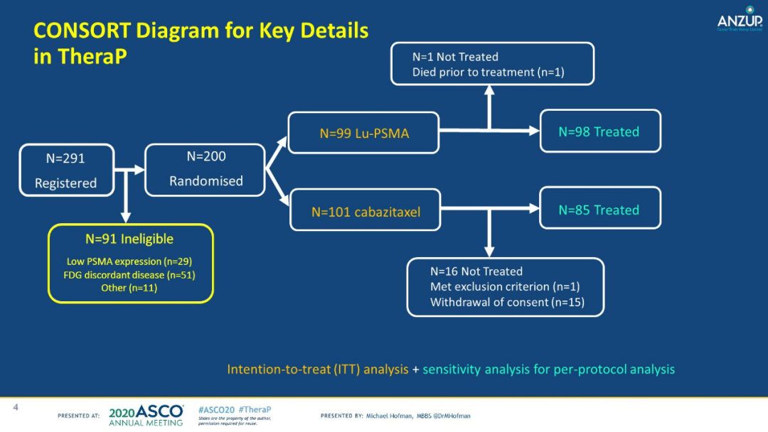 研究背景:LuPSMA是一种放射性标记的小分子化合物,其可向表达PSMA的肿瘤提供治疗性的β放射线。在一些非随机的研究中我们已经看到其在治疗mCRPC中令人鼓舞的效果和可靠的安全性。TheraP是一项随机对照Ⅱ期临床试验,研究LuPSMA对比卡巴他赛在多西他赛治疗进展后的mCRPC患者的疗效。