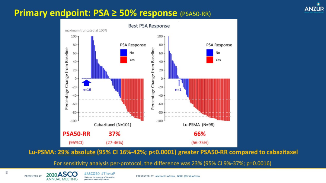 研究结果:291例患者接受了PET扫描,其中200例患者(中位年龄为72岁,先前接受过新型抗雄药物治疗的患者占比91%,>20个转移病灶的占比78%)被随机分到LuPSMA组(n=99)或卡巴他赛组(n=101)。17例患者在治疗前退出或者死亡(1例LuPSMA vs 16例卡巴他赛)。LuPSMA组的PSA50-RR相比于卡巴他赛组更高(65/99 [66%;95%CI 56~75] vs 37/101 [37%;95%CI 27~46];P<0.001))。在11.3个月的中位随访时间中,LuPSMA组显著提高了PSA-PFS(HR 0.63,95%CI 0.45~0.88,P=0.007)。疗效在符合方案集的患者中的分析结果与ITT人群相似。OS数据结果尚未成熟(57例死亡)。