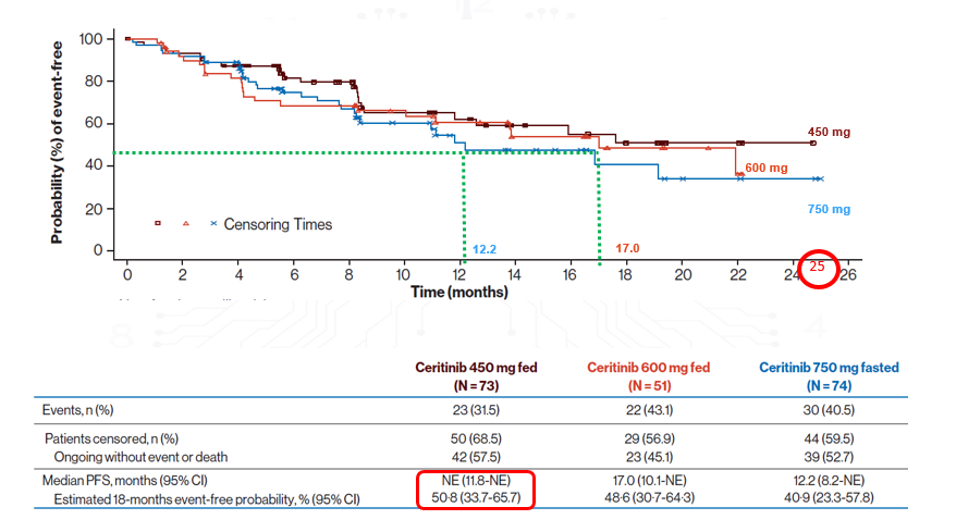 2)疗效:ASCEND-8的结果也显示,在解决了治疗依从性的问题后,450mg随餐随餐给药的疗效达到了新的高度,相比750mg空腹显示出了更多的获益趋势;其ORR高达78.1%, 25个月仍未达到,中位PFS仍未达到。