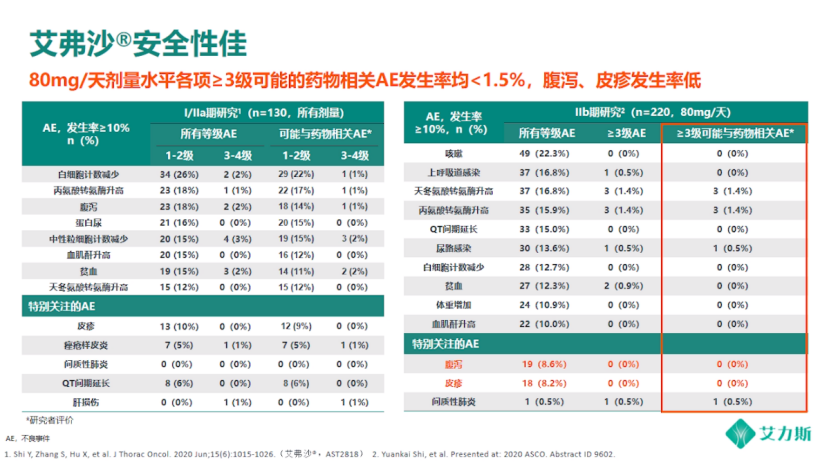 自2016年开始,甲磺酸伏美替尼开始了在NSCLC治疗的探索,在其关键临床研究设计中,纳入了ECOG 2分的患者,L858R突变、CNS转移的患者比例相对较高。其Ⅰ期剂量递增试验显示,患者用药剂量达到240mg/d时仍未观察到剂量限制毒性,且未获得最大耐受剂量,显示了良好的安全性。Ⅱa期剂量扩展研究剂量达到80mg即可取得很好的疗效,ORR达77.8%,原发T790M突变ORR可达100%,总体人群PFS为11.1个月。Ⅱb期研究以80mg/d做进一步延伸,今年ASCO公布的结果显示对T790M突变患者ORR可达74.1%,DCR 93.6%,PFS 9.6个月;并且可以有效控制CNS转移,CNS ORR 65.5%,CNS DCR 100%,CNS PFS 长达11.6个月。除了良好的效果,已经开展的Ⅰ期、Ⅱa期、Ⅱb期研究中,所有研究剂量组3级及以上药物相关不良反应约10%左右,而80mg/d剂量组各项3级及以上药物相关不良反应均小于1.5%,安全性极佳。