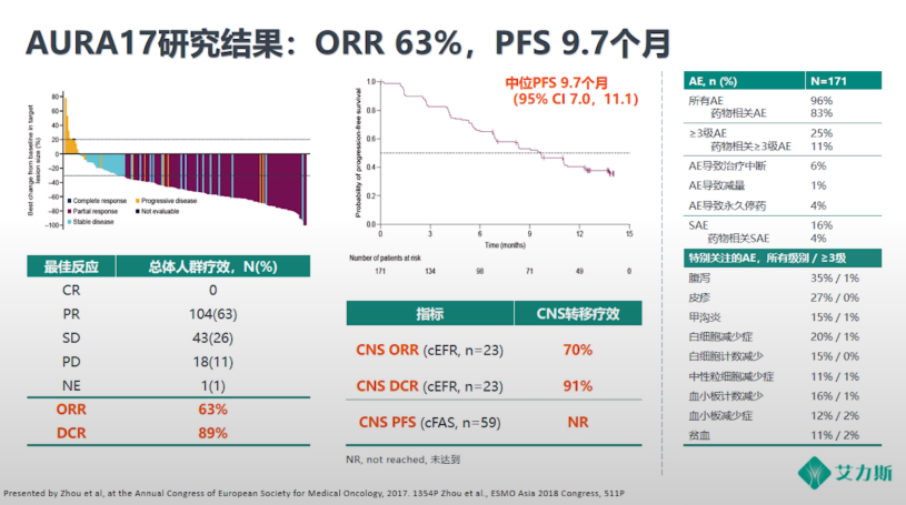 为了更好的克服耐药,三代EGFR TKI在保留不可逆结合特性的同时,将喹唑啉母环更换为嘧啶母环,增加对T790M抑制作用的同时增强了选择性。AURA3研究对一线EGFR治疗后耐药患者分别使用了奥希替尼和化疗,结果显示,奥希替尼较化疗可显著延长患者PFS(10.1个月vs 4.4个月)。针对亚裔人群使用奥希替尼二线治疗的AURA17研究PFS也达9.7个月,显示三代EGFR TKI能够更好地解决耐药问题。