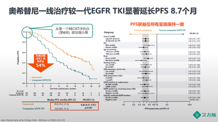 相较于欧美人群,EGFR突变是中国肺癌最常见的驱动基因,几乎占到一半,所以EGFR TKI的探索与应用至关重要。在精准治疗时代以前,对于未筛选的肺癌患者,一代EGFR TKI获益有限,PFS仅3个月左右;随着EGFR突变人群筛选的应用,精准治疗时代真正开启,一代EGFR TKI对此类人群的PFS获益提高到接近1年。