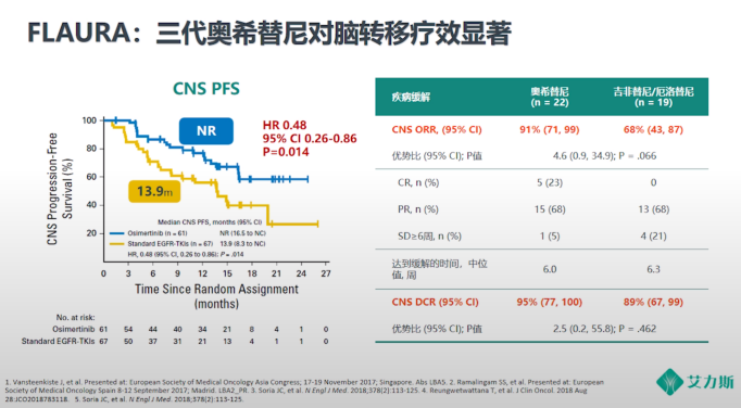 研究共有46家单位参与,入组了220例患者,其中有87例伴有明确的脑转移病灶,所有患者口服甲磺酸伏美替尼80mg/d直至疾病进展或不能耐受,结果显示ORR达到74.1%,DCR 93.6%,mPFS 9.6个月。总体疗效基本与奥希替尼相当,因此可以看到国产药物研发水平逐渐与国际新药齐头并进。甲磺酸伏美替尼在脑转移人群中的疗效也非常优异。截至2019年11月CNS ORR达65.5%,CNS DCR率为100%,更新后的中位CNS PFS为11.6个月,说明该药及其代谢产物能够很好的透过血脑屏障,产生较好的中枢神经系统的活性。