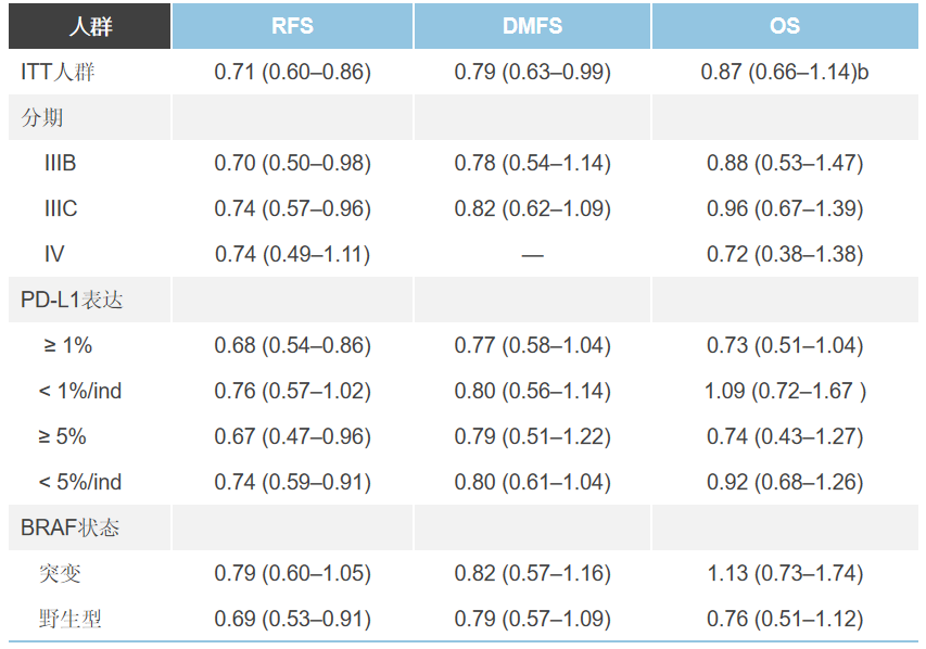 在2018年Eggermont等人发表于新英格兰杂志的2年随访结果中,已经看到了帕博利珠单抗相对于安慰剂的显著RFS获益,12个月RFS率分别为75.4%和61%,HR值是0.57,并且在PD-L1表达阳性和阴性人群中的HR值分别为0.54和0.47,均相对安慰剂组具有显著优势,RFS在PD-L1阳性组(77.1% Vs 62.6%),PD-L1阴性组(70.1% vs 55.6%)。在ⅢA、ⅢB和ⅢC期亚组的HR值分别为0.32、0.56和0.58,也说明在各个亚组中均具有显著差异。在BRAF野生型和突变型人群中的HR值分别为0.64和0.57,免疫治疗在突变型中的作用亦不容忽视。