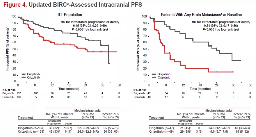 ITT人群中,Brigatinib组 vs 克唑替尼组BIRC评估的中位颅内PFS:32.3个月 vs 24个月(HR=0.45,P=0.0001);2年颅内PFS率:65% vs 50%。