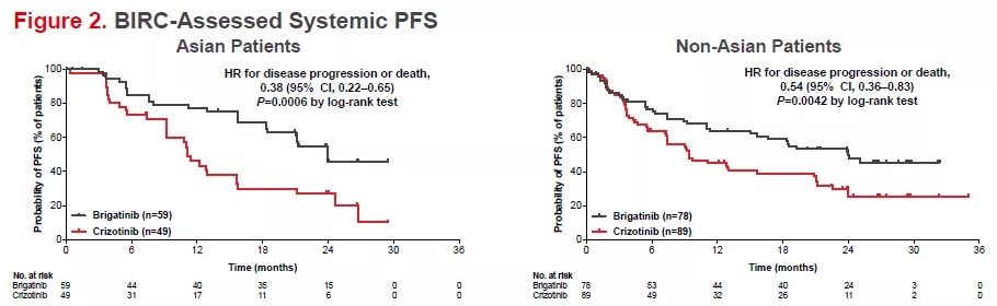 截至2019年6月28日,41例亚裔患者(Brigatinib组33例,克唑替尼组8例)和57例非亚裔患者(Brigatinib组42例,克唑替尼组15例)仍在接受治疗。克唑替尼组分别有25例亚裔患者和36例非亚裔患者交叉使用Brigatinib。