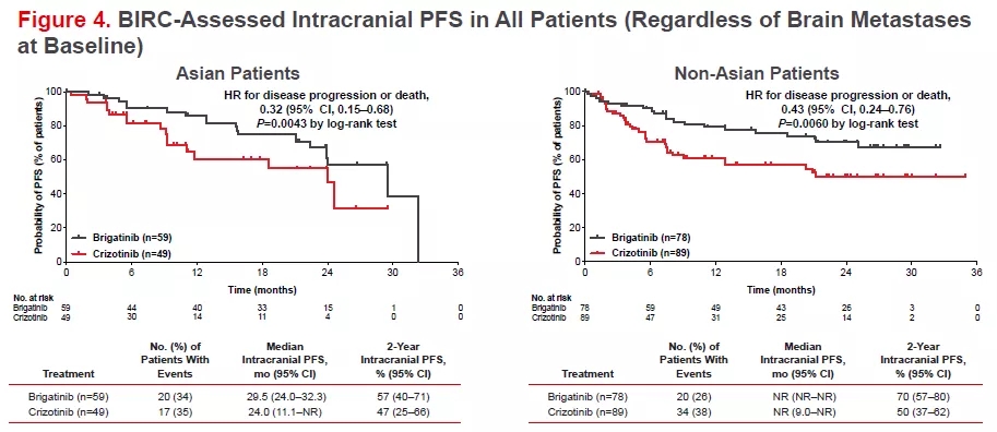 基线合并脑转移的亚裔患者中,Brigatinib组 vs 克唑替尼组BIRC评估的ORR:62% vs 33%(OR=6.00,P=0.0322)。无论基线脑转移状态,所有亚裔患者中,Brigatinib组 vs 克唑替尼组BIRC评估的颅内PFS:29.5个月 vs 24个月(HR=0.32,P=0.0043);2年颅内PFS率:57% vs 47%。