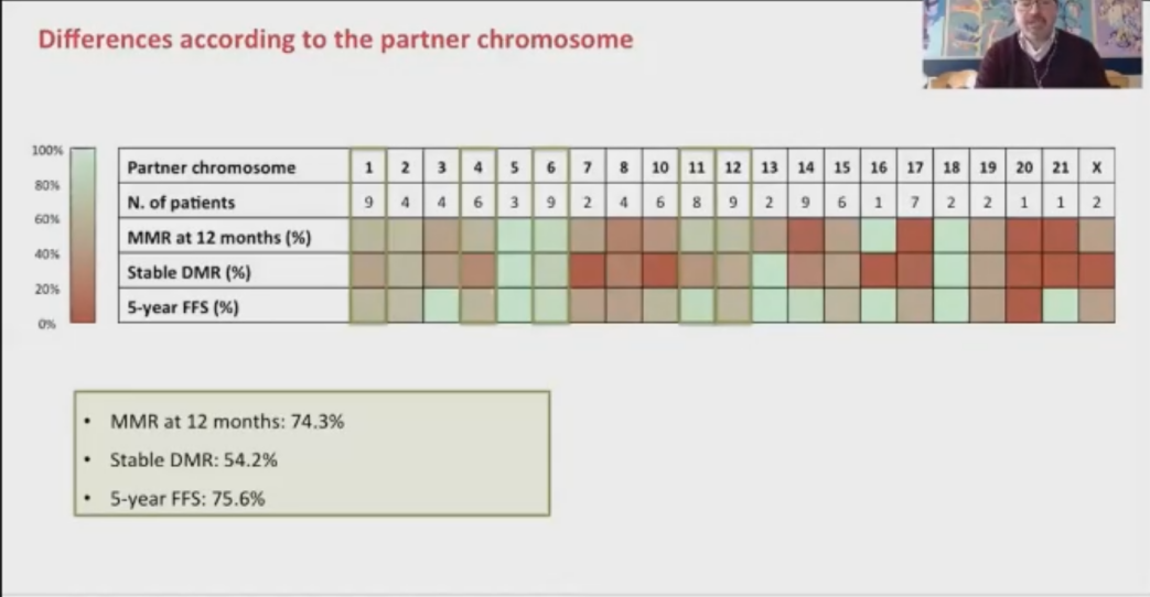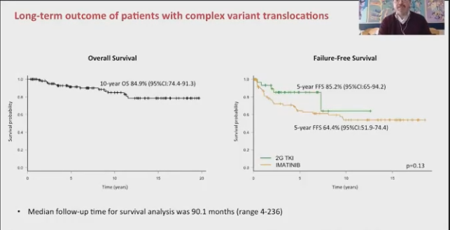 在9;22号染色体易位之外,额外累及至少一个染色体被称之为复合变异型易位(CVT)。意大利19个中心3361例新诊断CML患者中,CVT发生率为3.2%(109例),87%(95例)为3相易位(除9;22号外,还有一个额外的染色体参与易位),4相和5相易位各有13例和1例。一线治疗采用伊马替尼和2G-TKI者12个月最佳疗效率分别为53%:76%(p<0.05)。中位随访91.3个月,伊马替尼和2G-TKI治疗的5年EFS分别为66%和84%。该研究再一次强调了骨髓染色体在新诊断CML患者中的预后预测价值。